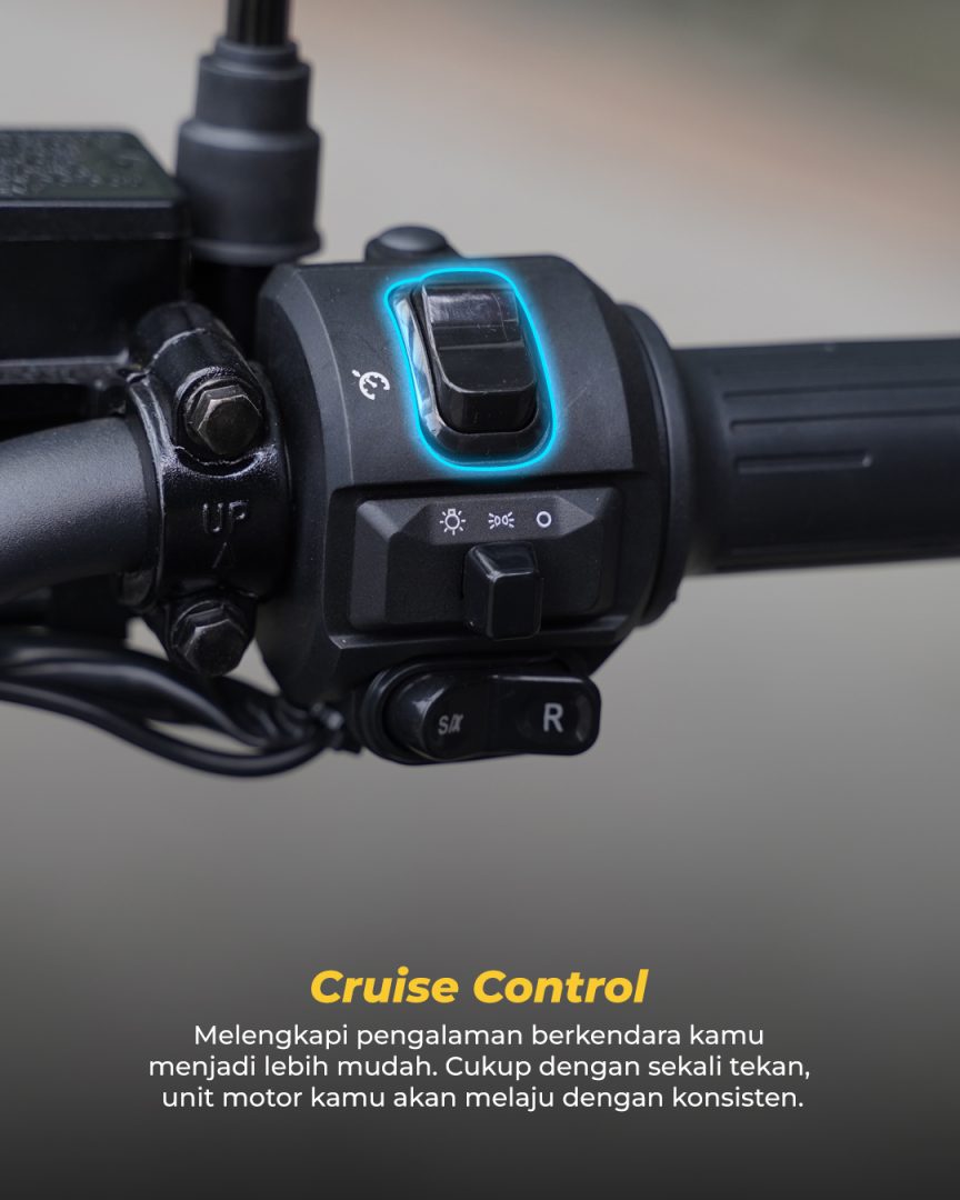 Fitur Cruise Control menjadi nilai tambah yang jarang ditemukan pada motor listrik di kelasnya. Dengan cruise control, pengendara dapat mempertahankan kecepatan konstan tanpa perlu terus menekan throttle. Cukup dengan sekali tekan pada kontrol yang terletak di handlebar, unit motor akan melaju dengan kecepatan konsisten. Fitur ini sangat berguna untuk perjalanan jarak jauh, mengurangi kelelahan tangan, dan membuat pengalaman berkendara menjadi lebih nyaman dan efisien.